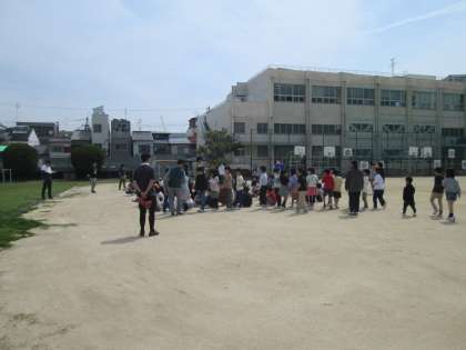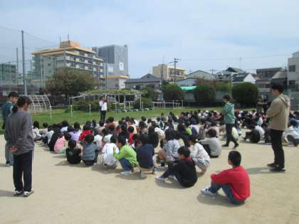 子ども達は慌てず先生の後について、運動場に出て集まることができました。