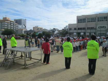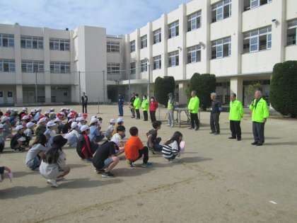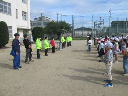 今朝の児童朝会は運動場で行いました。全校児童の前に並んでくださったのは、『十三子ども見守り隊』と『セーフティー淀川』のみなさんです。子ども達が安全に登下校できるよう、毎日、通学路の危険な箇所に立って見守り活動をしてくださっているみなさんと、一年の始めに対面式を行っています。