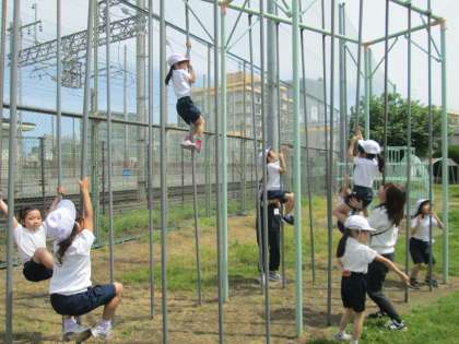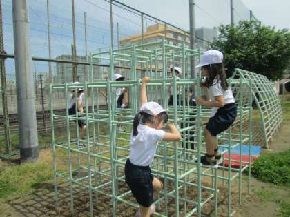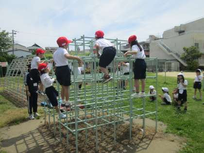最後はジャングルジムで遊びました。「てっぺんまで上って、ゆっくり降りてきましょう。」、「ジャンぐジムの周りを、右にぐるっと一周まわりましょう」。先生が発表する遊び方のルールを聞いて、いろいろな動きを楽しみました。