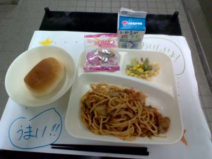 ミートソーススパゲッティは、トマト味で食べやすく、とても人気がありました。サラダは歯ごたえもよくコーンの甘味もありスパゲッティによく合いました。今日もおいしくいただきました。