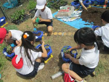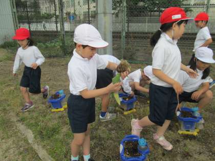 植木鉢に新しい園芸用の土を入れて、ミニトマトの苗を植えました。最後に水をたっぷりとやって、できあがり。「明日からは朝きたときに、水やりしなあかんなぁ。」と、お友達と笑顔で話していました。