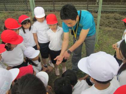 球根を抜いた時にミミズを見つけた子がいたので、担任の先生が手に乗せて「ミミズが土や小さな生き物をを食べて、畑の栄養をつくってくれているんだよ。」と教えていました。