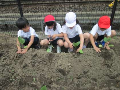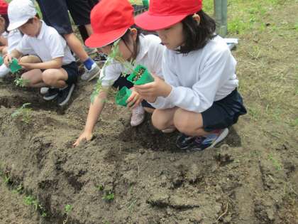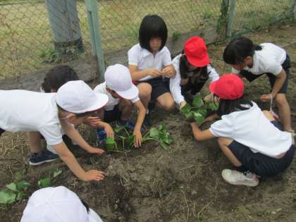 最後に植えたのはサツマイモの苗です。担任の先生の「長く伸びた茎を畝の上に横に寝かせて、茎がかくれるように土をかけましょう。」という植え方のお話を聞いて、グループで協力して植えました。秋の芋ほりが楽しみです。