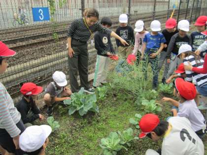 小さな青虫が葉っぱにくっついています。また、モンシロチョウの卵がついているのを見つけた子もいました。
