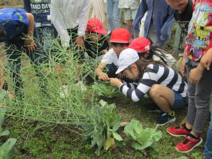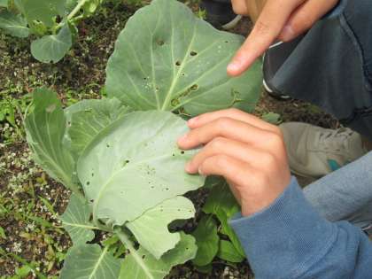 畑にを囲むように座って、植えられたキャベツを観察してみます。キャベツの葉には小さな穴がいくつも空いていて、どうやら何かに葉を食べられたようです。さらに顔を近づけて見たり、葉を持って裏返してみると…。