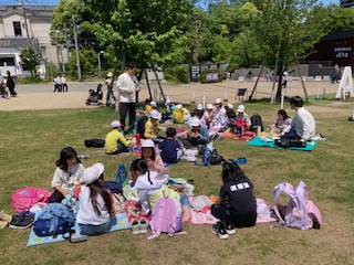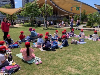 「てんしば」で気持ちよい風の中、パクパクとあっという間にお弁当をたいらげました。楽しみにしていたおやつを食べて、帰路につきました。