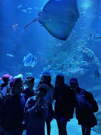 長距離ですが電車を乗り継いで、水族館に着くと、学年混合のグループ行動で見学を始めました。