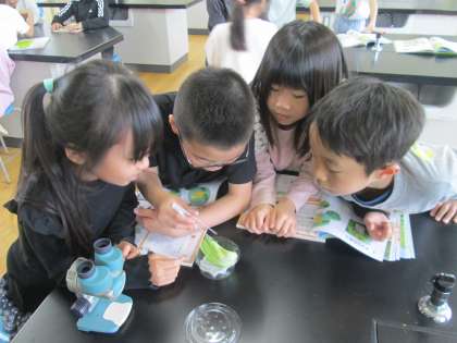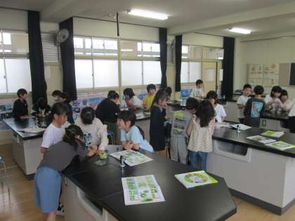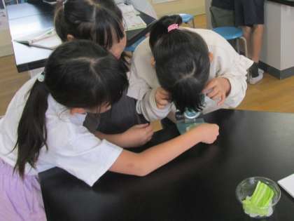 理科室では3年生が、双眼実体顕微鏡を使って青虫の観察をしていました。