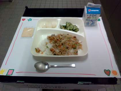 今日は「豚丼、きゅうりの梅風味、白玉だんご(きな粉)、牛乳」でした。豚丼は甘辛い味付けが好評で、「家でも作ってもらいたい」という声も聞きました。きゅうりの梅風味は、梅の風味がよく歯ごたえもよかったです。デザートの白玉だんごは、もちもちとした食感がよく、きな粉をかけて食べました。