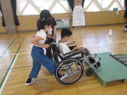 子ども達は実際に車いすを押す体験学習を通して、車いすを利用している人やベビーカーを押す人にとって、歩道の段差や狭い所にたいへん苦労することがわかりました。