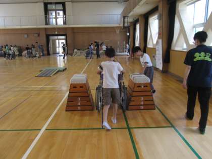 跳び箱と跳び箱の間を通るときは、左右のタイヤがぶつからないように慎重にまっすぐ車いすを押しました。歩いて通るには充分な間隔なのですが、ハンドルの幅よりもタイヤが左右に出ているのでぶつからないように気を遣いました。