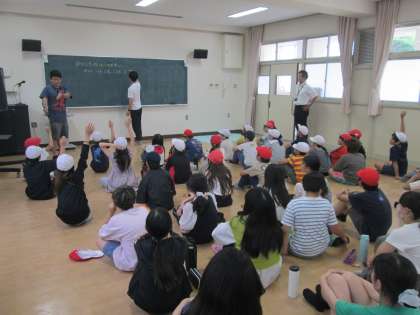 また、「災害のときにはどのような危険が町にはあると思いますか?」という問いかけには、「建物や塀、電柱が倒れてくる。」や「看板やガラスとかが落ちてくる。」、「浸水するとマンホールや側溝のフタが浮いてしまう。」といった、意見が出ました。