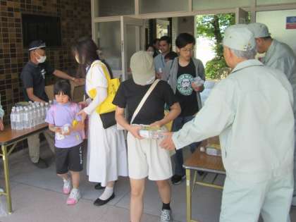 また引き渡し後には、淀川区から提供していただいた備蓄水と簡易トイレを、玄関で地域の防災リーダーのみなさんが児童に配布してくださいました。