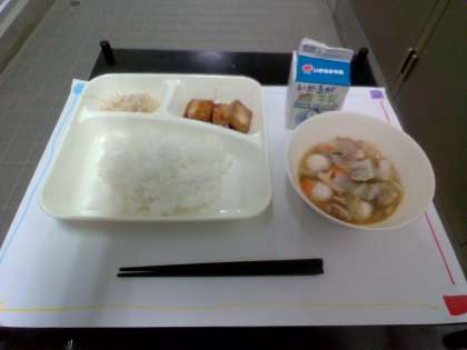 今日は「八宝菜、あつあげのピリ辛じょうゆかけ、もやしの中華あえ、ごはん、牛乳」でした。八宝菜は豚肉、うずら卵、キャベツなどの野菜を使った具だくさんの八宝菜でした。ボリュームがあり、ごはんにもよく合いました。あつあげのピリ辛じょうゆかけは、ピリ辛のたれがあつあげによく合いました。もやしの中華あえのもやしは歯ごたえよくさっぱりとして食べやすいおかずでした。