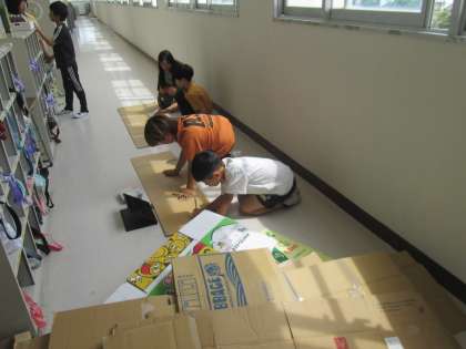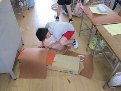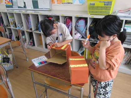 いよいよ一週間後に迫ってきた全校集会の開催に向けて、2時間目は最後の準備の時間です。それぞれの教室ではゲームのための用具を作ったり、お客さんに渡すプレゼントの準備をしたりするなど、開店準備に追われていました。