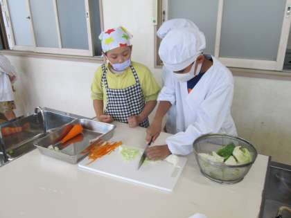 グループのメンバーで協力して、キャベツや人参、ブロッコリーをよく洗ってから、食べやすい大きさに切っていきます。子ども達は真剣な表情で慎重に、丁寧に包丁で野菜を切っていました。