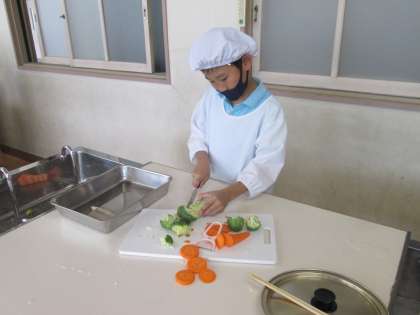 5年生は家庭科の調理実習で、『カラフルゆで野菜サラダ』をつくりました。前回は緑茶を煎れましたが、2回目の今回は初めて包丁を使う調理実習です。