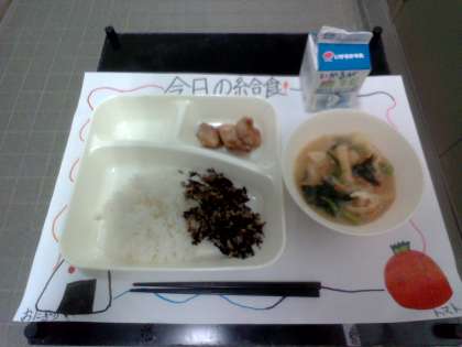 今日は「鶏肉のてり焼き、みそ汁、魚ひじきそぼろ、ごはん、牛乳」でした。大き目の鶏肉に甘辛いたれをつけてこんがり焼きました。みそ汁は、煮干しでだしをとった具だくさんのみそ汁でした。それとごはんによく合う魚ひじきそぼろでした。魚ひじきそぼろは魚ミンチとひじき、しそを組み合わせたごはんによく合うおかずでした。
