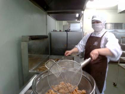 今日は「えびのチリソース、中華スープ、ヨーグルト、コッペパン、アプリコットジャム、牛乳」でした。えびのチリソースは、えびに下味をつけ、でんぷんをまぶして、油でカラッと揚げました。そのエビに、ケチャップ、トウバンジャンなどで甘辛く味をつけた、たまねぎの入ったソースをからめました。少しピリッとして、そして、ケチャップの酸味甘味、にんにくの香りもよく、とても人気がありました。それと具だくさんの中華スープとデザートにヨーグルトがつきました。