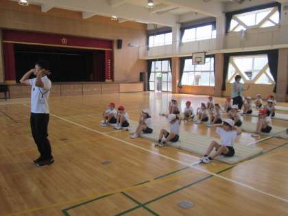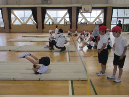 まずは後転の基本になる「ゆりかご」をします。マットに並んで座り、ヒザを抱えて背中をまるめ、後ろに揺れてまた元の姿勢に戻ります。「後ろに転がったときに両手を着こう。」、「次は足の先で床にタッチしてみよう。」、「最後は両手を着いてから、足の先でタッチしよう。」と、少しずつ難しくしていきます。