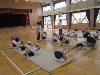 スポーツ出前授業の後半は、苦手にしている子が多い後転の練習をしました。