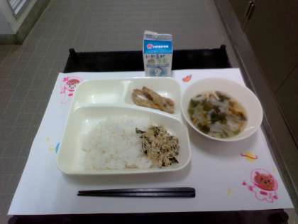 今日は「いわしてんぷら、五目汁、とりなっ葉いため、ごはん、牛乳」でした。いわしてんぷらはカラッと揚がったいわしてんぷらに甘辛いたれをかけました。五目汁はだし汁のうまみがよく感じられる汁ものでした。とりなっ葉いためはごはんによく合い、みんなよく食べていました。