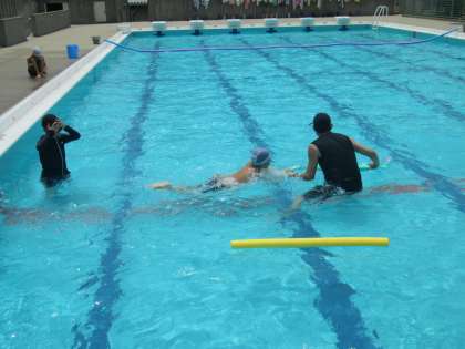 この日の最後は「魚おくりゲーム」をしました。長い棒につかまると、その棒を3人の先生がどんどんおくって、あっという間にプールの反対側までたどり着きます。プールの水面をスイスイ泳ぐ気持ちよさを、子ども達は味わっていました。