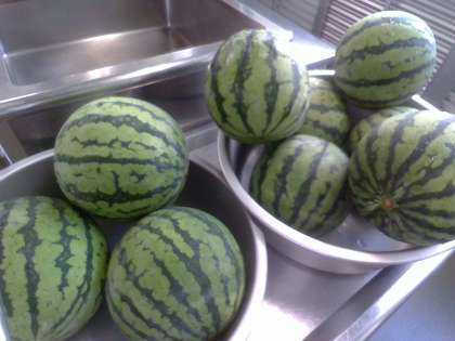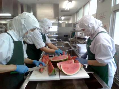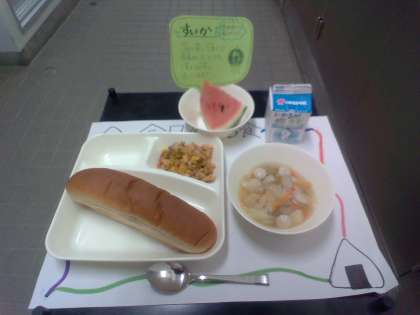 今日は「パエリア、ウインナーとキャベツのスープ、すいか、黒糖パン、牛乳」でした。パエリアには鶏肉、たまねぎ、ピーマン、トマトなどを使い、ふっくらこんがり焼き上げました。スープは具だくさんでボリュームもあり、パンによく合いました。それと、年に一度だけ登場する季節の果物「すいか」がつきました。給食室で、一玉を64等分に丁寧に切り分けました。