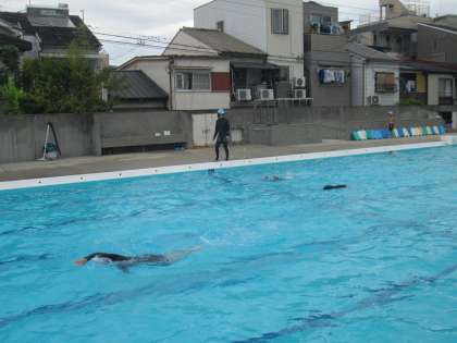 泳力は練習の積み重ねや、体力などで変わります。中には20mを越えてからも、あと2m、あと1mとねばって泳いで、25mの壁にタッチしてとっても喜んでいる児童もいました。