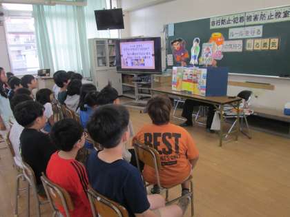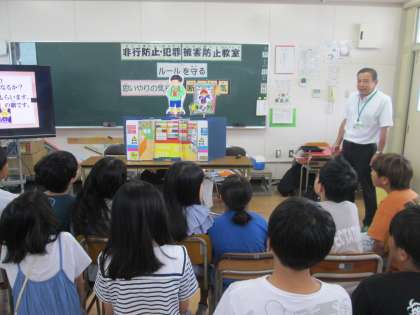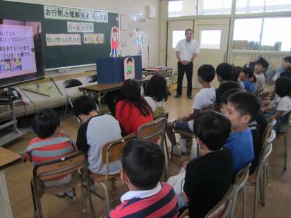 大阪市では毎年、小学生や中学生が万引きで補導される事案が多いそうです。『非行防止教室』の後半は、ピース君という男の子がマンガが欲しいという誘惑に悩む劇を、ペープサートで見せていただきました。