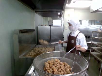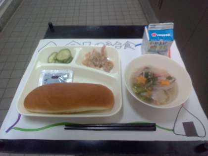 今日は「鶏肉のからあげ、ハムとはるさめのスープ、きゅうりの中華あえ、コッペパン、ブルーベリージャム、牛乳」でした。