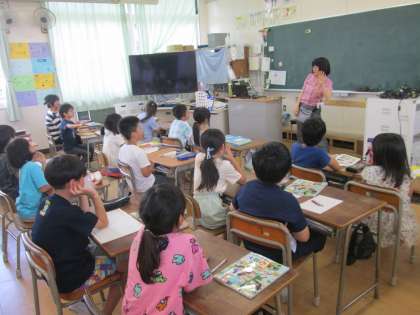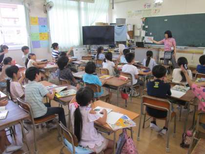 3年生は社会の復習をしていました。大阪市の区の並び方を、体操のように手を上から下へ、右から左へと動かして覚えました。