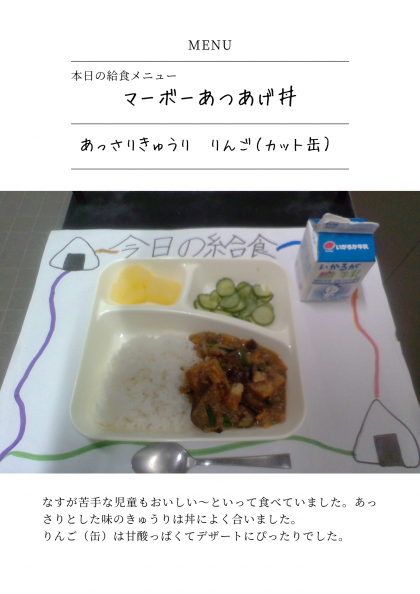 今日は「マーボーあつあげ丼、あっさりきゅうり、りんご(カット缶)、牛乳」でした。マーボーあつあげ丼は、ごはんによく合い、なすが苦手な児童もこれなら食べられる!といってよく食べていました。まだまだ、暑い日が続きそうですが、しっかり食べて元気に過ごしてほしいと思います。