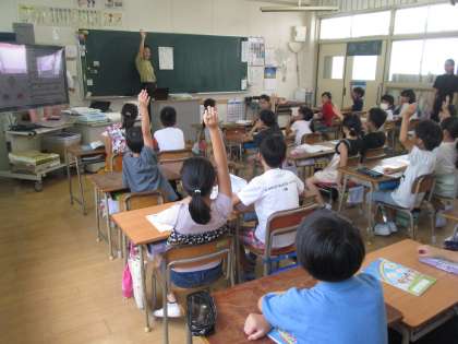 Anne先生が「I like Filipino Version Shaved Ice.」と自己紹介をして、フィリピンのかき氷を大型テレビに映して見せてくれました。私達が「かき氷」と聞いてイメージするものと、フィリピンのShaved iceはまったく違っていて、子ども達はたいへん驚いていました。フィリピンのShaved iceはアイスだけでなくゼリーやタピオカ、小豆、クラッカーなどいろいろなものが入っていてとってもカラフルです。
