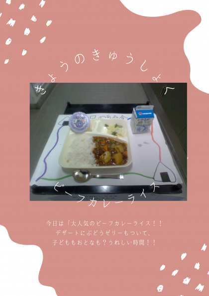 今日は「ビーフカレーライス、野菜のピクルス、ぶどうゼリー、牛乳」でした。昨日、児童が「明日も楽しみ、台風で給食がなくなったらいやだなあ」と言っていました。