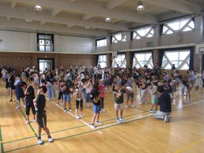 2学期最初の児童朝会でも、みんなで体操をしました。体を右や左に倒してから、ひねって天井を見たり、床を見たり。体幹を意識して行うことで、姿勢も良くなります。