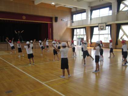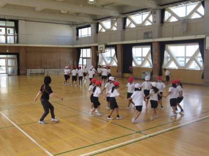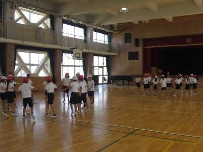 3年生も運動会のダンスの練習を始めました。日本の盆踊りや懐かしいフォークダンスなど、いろいろなダンスをつないでいくそうです。子ども達は先生のお手本をマネして踊りをマスターして、音楽に合わせて楽しく踊っていました。