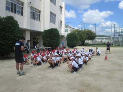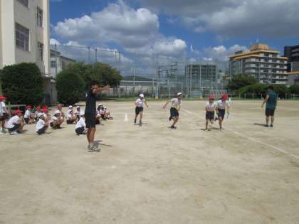 スポーツ出前授業の2時間目は、5年生と6年生が4つのチームに分かれてリレーをしました。講師の先生から教えていただいたバトンパスのコツや、練習でつかんがリードの間隔を活かして白熱したレースになりました。