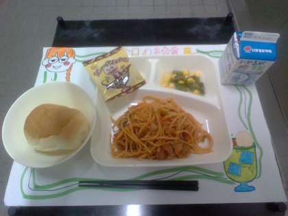 今日は「イタリアンスパゲッティ、グリーンアスパラガスとコーンのサラダ、カレーフィッシュ、ミニコッペパン、牛乳」でした。スパゲッティは人気のケチャップ味で、みんなよく食べていました。サラダはさっぱりとしてパスタによく合いました。それと新食品のカレーフィッシュの組み合わせでした。