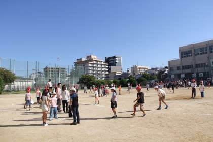 青空の下、オニ役の子どもの「だ〜る〜ま〜さ〜ん〜がぁ〜、ころんだっ!」という可愛らしい声が響いて、楽しそうな子ども達の笑い声が運動場いっぱいにあふれていました。