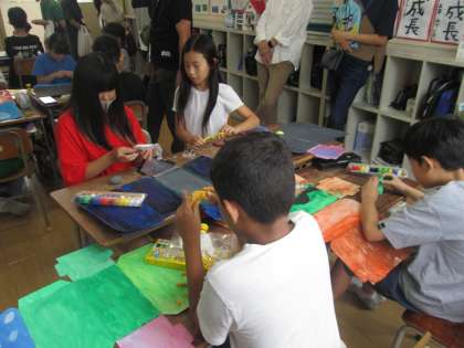 5年生は図工で、不思議な箱を作りました。長い箱の端に空いた穴をのぞいてみると、そこには巨大恐竜が歩く大地や、惑星がならぶ宇宙空間、車が空を飛ぶ未来の世界が広がっています。