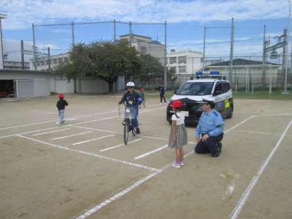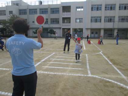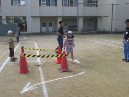 その後、運動場に描かれた道路の線をつかって、一人ずつ道路を安全に歩く練習をしました。止まれの標識でとまって左右を見る、横断歩道は車の来ないの確かめてから手を挙げて渡る。
