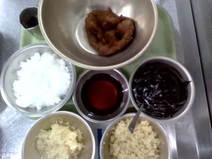 今日は「タンタンめん、あっさりキャベツ、豆こんぶ、黒糖パン、牛乳」でした。タンタンめんは、テンメンジャン、赤みそなど(写真上)を使った肉みそを汁めんにのせました。「おいしい〜。お家でも作ってもらう」という声がありましたので、ホームページにタンタンめんの作り方載せました。ぜひ作ってみてください。