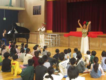 第2部が始まると、オペラ歌手の方が声楽についての体験コーナーを開いてくださいました。「歌うときや声を出すとき、そのエネルギーになるのは、たくさん吸った息です。」と教えてくださって、子ども達に腹式呼吸の仕方やドレミの音階に合わせて発声練習をしてくださいました。