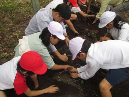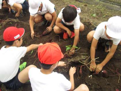 畑でサツマイモ掘りをしていると、ミミズや昆虫の幼虫が出てくることもありました。4年生は理科の授業で土の中で育つ幼虫のことも学習しています。