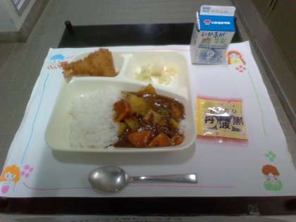 今日は「えびフライカレーライス、カリフラワーのピクルス、いり黒豆、牛乳」でした。えびフライカレーライスは、えびフライが添えられたカレーライスで、もちろん、大好評!!それとさっぱりとしたカリフラワーのピクルスといり黒豆の組み合わせでした。