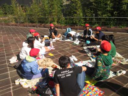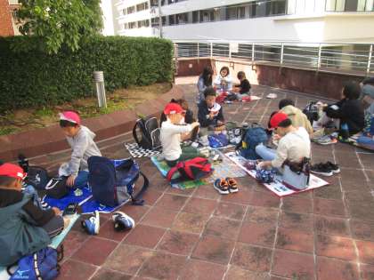 科学館の前の広場でお弁当とおやつを食べました。秋とは思えない陽気で、お友達の会話もはずみます。