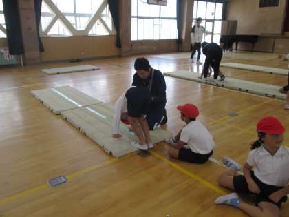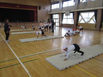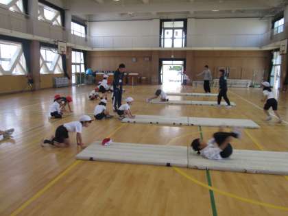 2年生も器械体操の出前授業をしていただきました。まずは1年生と同じ基本の前転がりからスタートです。
