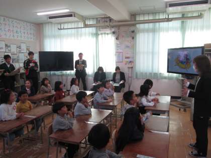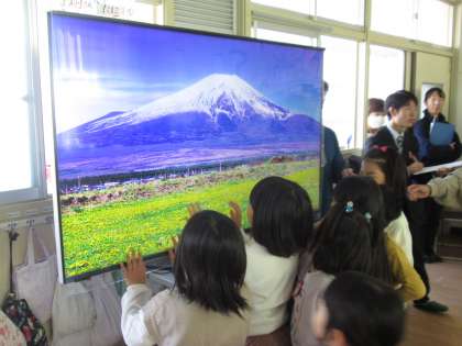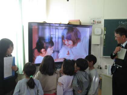 授業では担任の先生が船長さん、1年生の子ども達が船員さんになって、3つのモニターに大きく映し出された場所やものを見て、素敵だなと思ったことを報告しました。