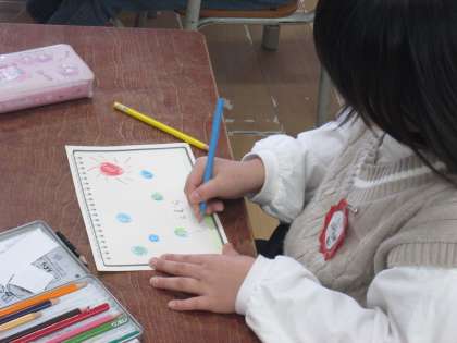 授業の後半は、宇宙船の小さな船員さん(1年生)たちに、船長さん(先生)から新たなミッションが出されます。「みなさんがこれまでに見つけた素敵なものを、絵や文でかいて報告してください」。1年生の子ども達はこれまでの思い出や、いろいろな経験をふりかえって、丁寧に報告書を描きました。